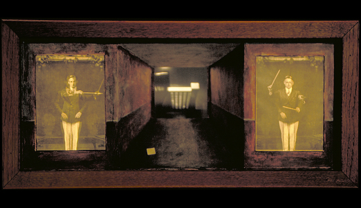 finished wood, glass, binder's board, museum board, acrylic paint, silver-gelatin print, found printed imagery