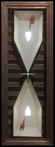 wood, plexiglas, binder’s board, museum board, vellum, dyed leather, light fixture,glass lens, acrylic paint