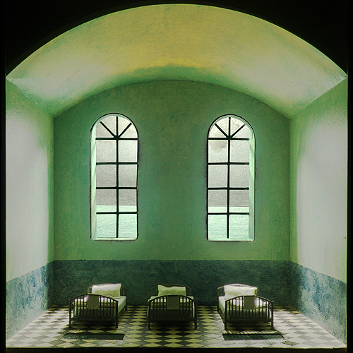 wood, plexiglas, binder’s board, museum board, cloth, metal leaf, india ink, joint compound, found objects, miniature tintypes, styrofoam, enamel & gold gilt glass, light fixtures, acrylic paint